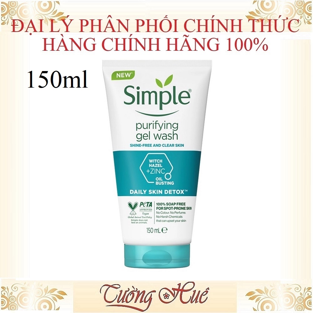 Gel Rửa Mặt Simple Purifying Gel Wash với bảng thành phần chứa 5% Cây Phỉ - Witch Hazel - kiểm soát nhờn, giảm bóng dầu, .
