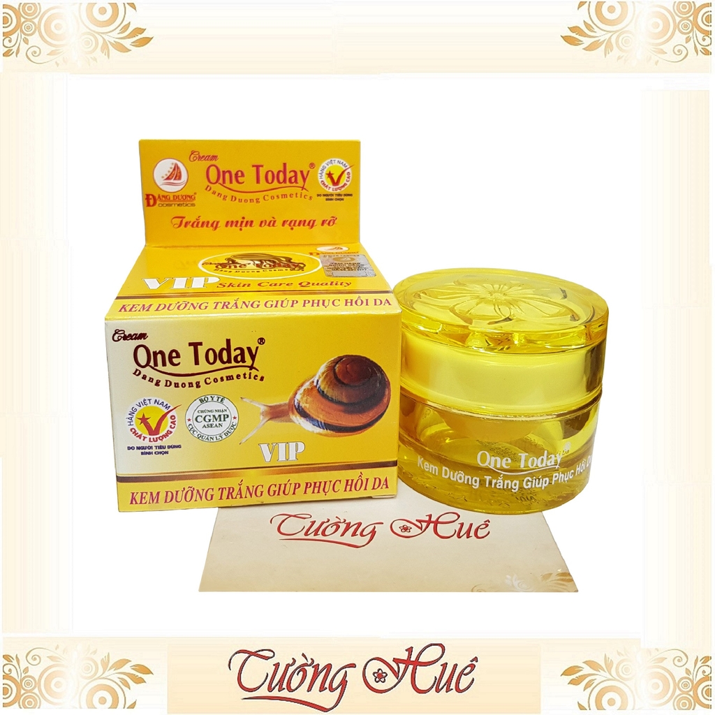 Kem One Today Dưỡng Trắng Giúp Phục Hồi Da với chiết xuất từ các tế bào gốc, Vitamin E, C, B3, Bột Ngọc Trai, Tinh chất Ốc Sên,...giúp dưỡng da trắng sáng từ sâu bên trong, phục hồi làn da hư tổn, làm mờ các vết nám, tàn nhang, se khít lỗ chân lông.