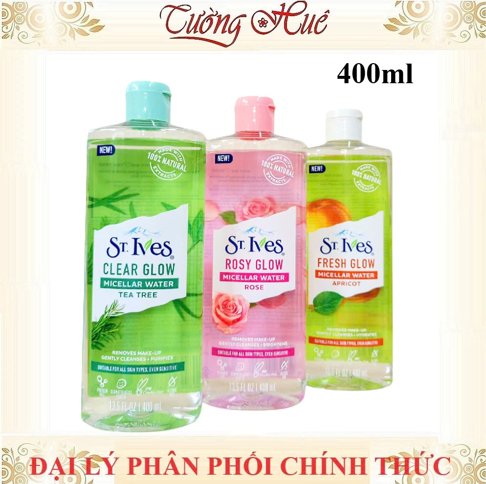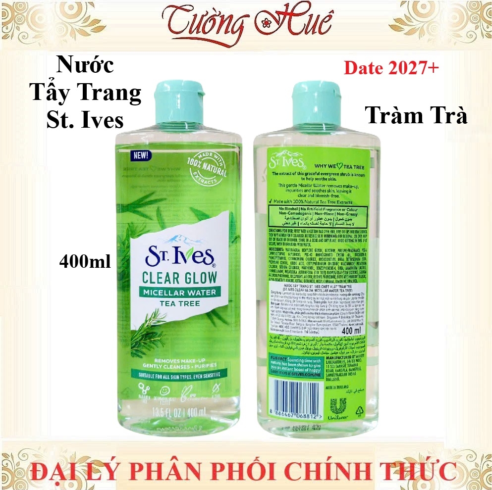 - St. Ives Clear Glow Micellar Water Tea Tree được chiết xuất từ Tràm Trà giúp làm sạch da, loại bỏ lớp trang điểm cho da ẩm mềm mịn.