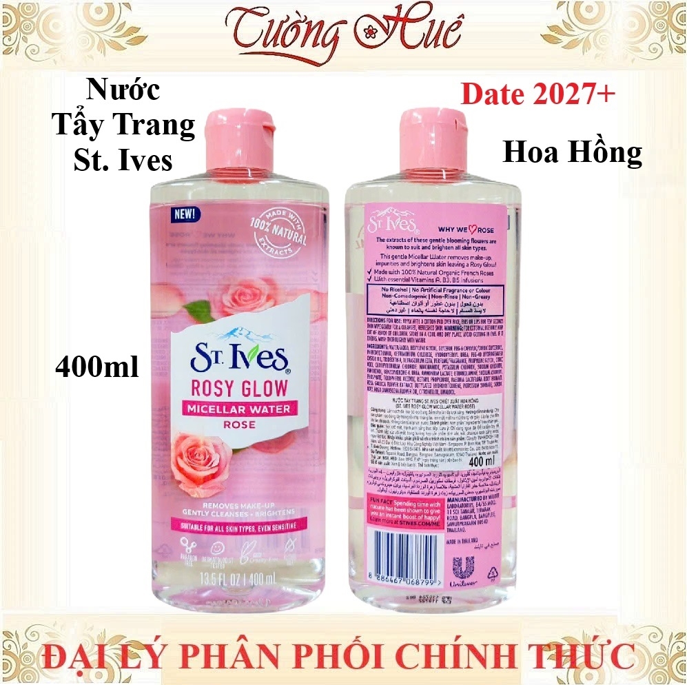 - St. Ives Rosy Glow Micellar Water Rose được chiết xuất từ Hoa Hồng hữu cơ tự nhiên của Pháp và các loại Vitamin A, B3, B5 thiết yếu để giúp cải thiện kết cấu da của bạn, mang lại làn da sáng khỏe.
