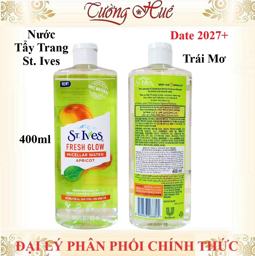 - St. Ives Fresh Glow Micerllar Water Apricot được chiết xuất từ Quả Mơ Tự Nhiên giúp loại bỏ các tạp chất như bụi bẩn, bã nhờn, tế bào da chết, v.v... Hơn nữa, còn giúp dưỡng ẩm hiệu quả cho làn da của bạn trở nên được tự nhiên mềm mịn.