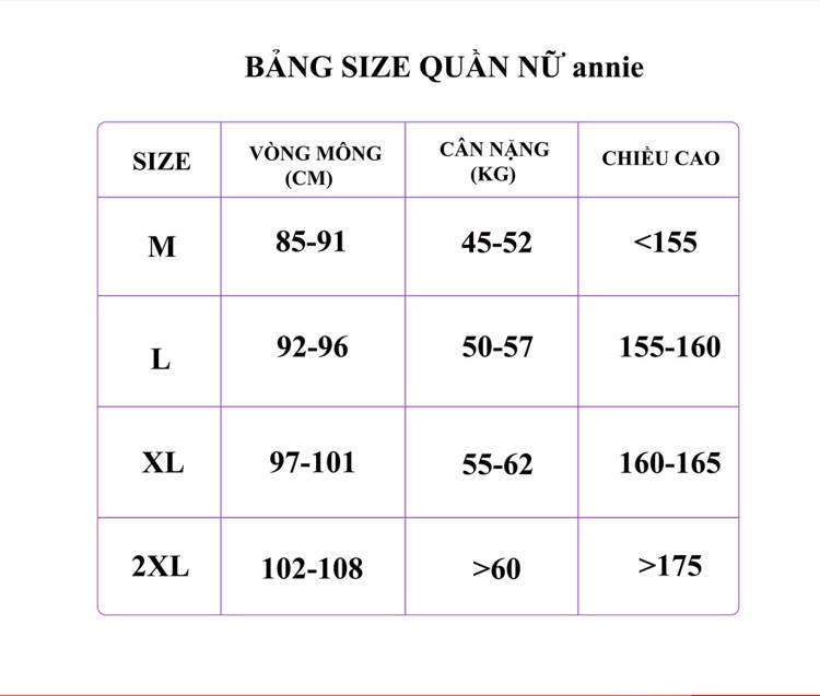 BẢNG ĐO THAM KHẢO KHI CHỌN QUẦN LÓT